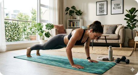 식사 타이밍: 홈트레이닝 1~2시간 전 가벼운 탄수화물 섭취, 운동 후 30분~1시간 이내 단백질 위주 식사가 이상적입니다.